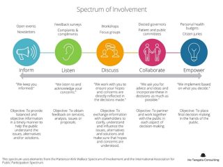 Different types of involvement use different techniques. “Giving information” might involve leaflets, radio adverts and public meetings; “getting information” might involve surveys, interviews and focus groups; “debate” might involve workshops or drop-in events; “participation” might involve service-users being on the management team. These methods are not mutually exclusive and some service planning or projects will incorporate a number of these techniques, depending on the issue under consideration, or the stage that the project is at.