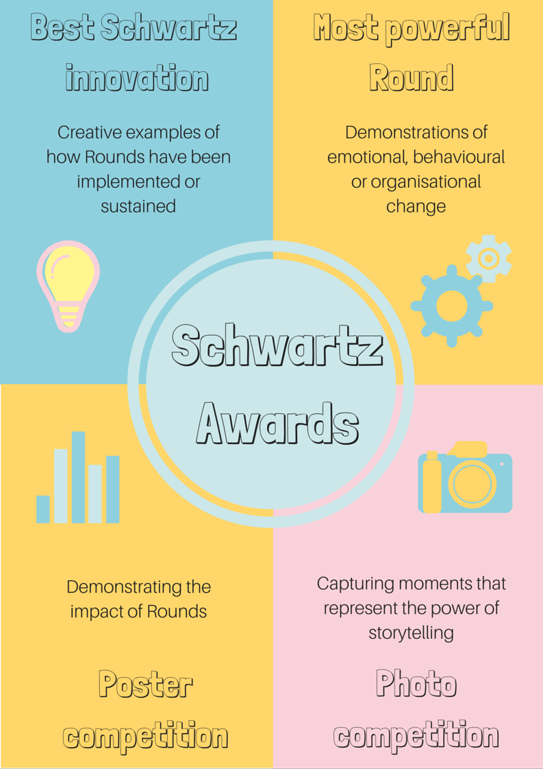Based on the idea of a Grand Round, Schwartz Rounds provide a facilitated reflective space, lasting for one hour. Schwartz Rounds are licensed in the UK by The Point of Care Foundation. Over 130 healthcare organizations (mainly NHS Trusts and some hospices) are running Rounds now in the UK. Key features of Rounds include the provision of food and refreshments before the Round begins; three or four panel members talking for five minutes on a topic each, in turn, uninterrupted and members of the audience being invited to share their thoughts and to share similar experiences and stories. Two trained facilitators contain and shape the discussion and help to steer the conversation away from problem solving/case discussions.
