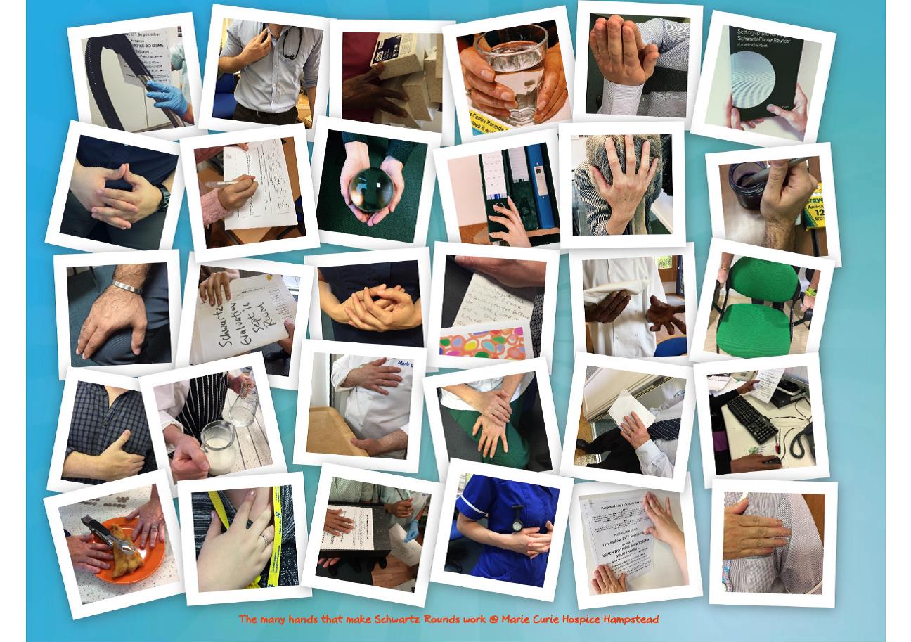 This photo conveys the power of the Rounds to bring people together from across the whole organisation. The photo is a collage of 30 hand shots, showing the hands of those who contribute to the success of our hospice Rounds. Together they capture moments of connection, which not only ensure the safety of our Rounds, but are also responses to the storytelling made possible in them.