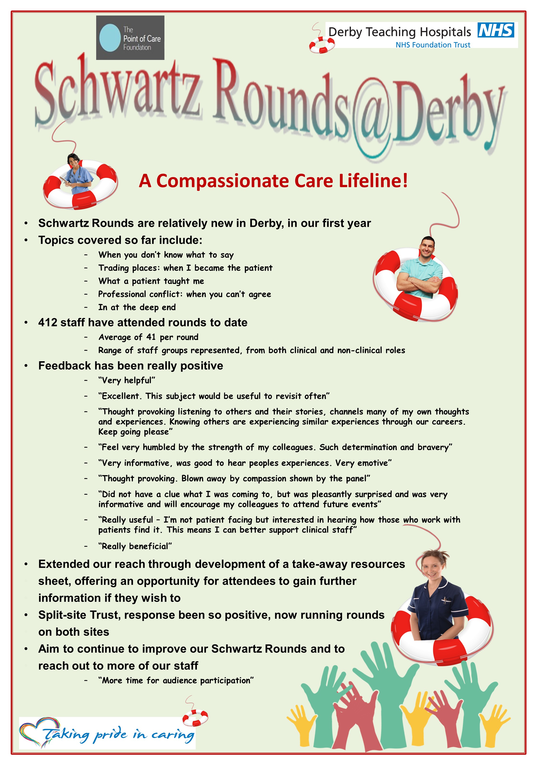 Derby Teaching Hospitals entry ‘A compassionate care lifeline’ portrays the journey and impact of Schwartz Rounds in a creative, clear and colourful way. The poster highlights the positive past of Rounds in their first year – and an optimistic future with plans for more innovation and engagement. It demonstrates that the reach of Rounds have extended to a wide and diverse range of staff and are valued by staff who attend. We especially liked the staff members placed inside safety rings – cleverly and creatively depicting Rounds as lifebuoys for staff.
