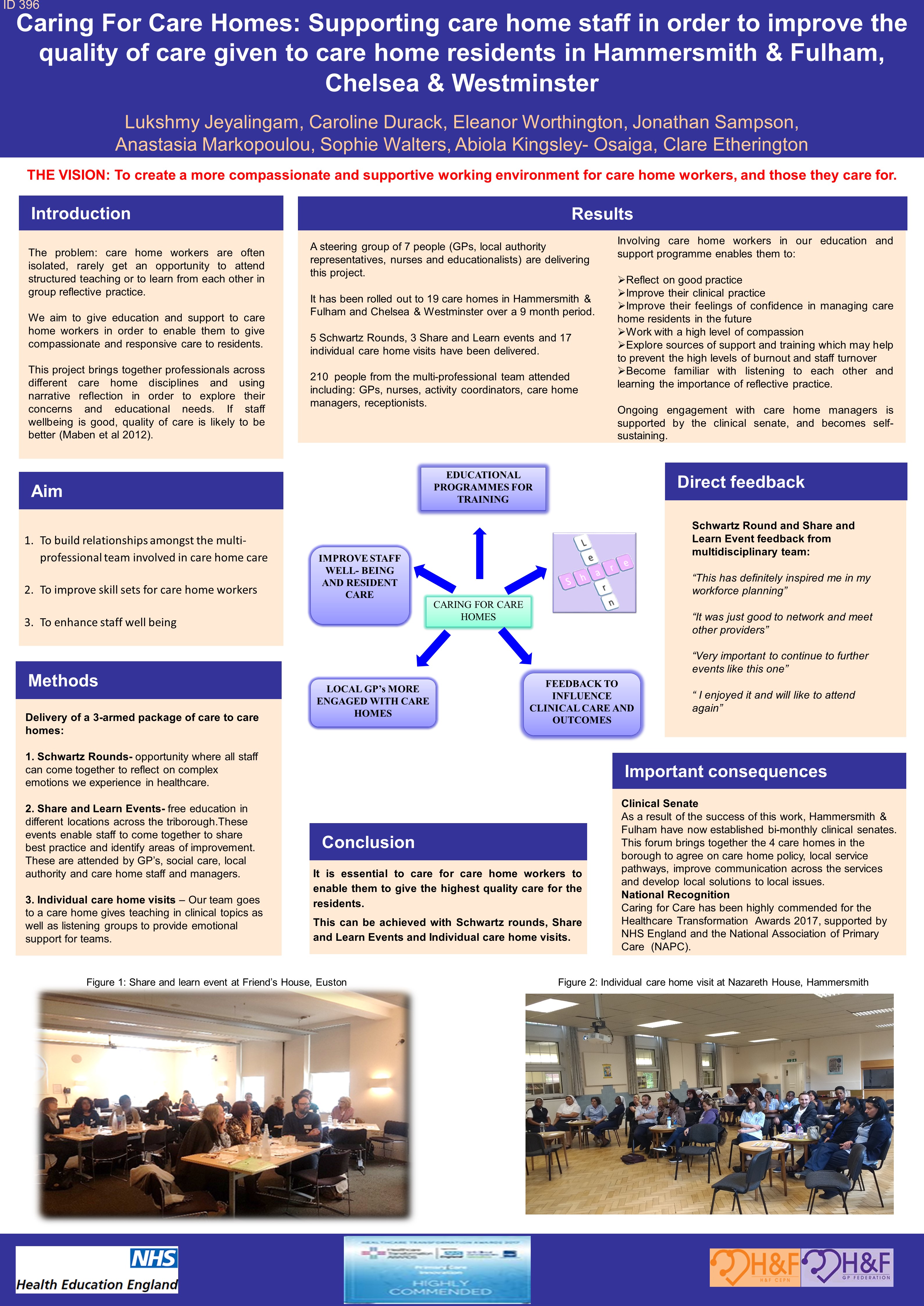 Derbyshire’s entry ‘Reaching out…Running Schwartz Rounds across a large rural community trust’, transcended logistical difficulties of running Rounds across a wide geographical area. It depicts an innovative and energetic plan for the future to continue to engage staff from all over the county and demonstrates evident commitment and support from admin and steering group. By continually building a network of clinical leads and facilitators, they ensure they feel supported and are able to perform their role well.