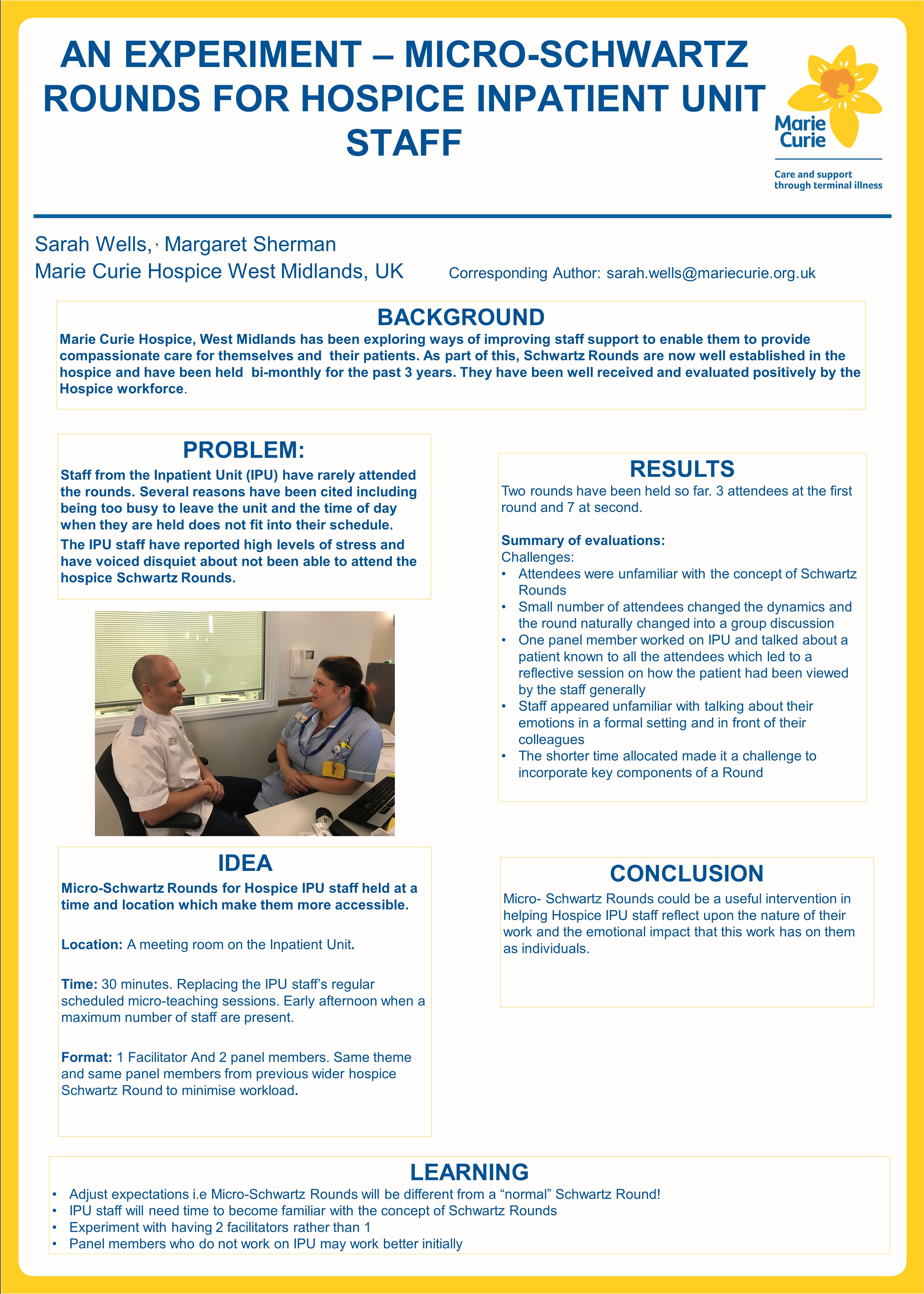 Ashford and St Peter’s were the first to create the concept of ‘Pop-up Rounds’: they gauged staff experience and directed staff to a form of Schwartz Rounds which was accessible to them. Their innovation has also helped to inspire many other organisations to run pop-ups. Farhana’s video beautifully demonstrated the process which led to this innovation, and also inspired the possibility of future innovations.